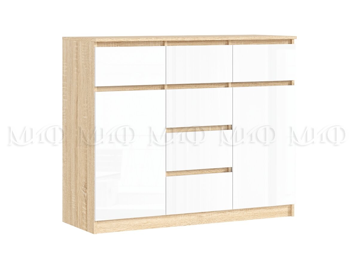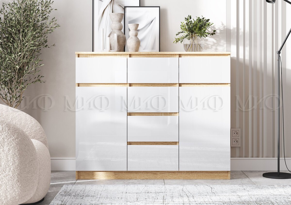 - Комод 1200 (2 двери 6 ящиков) Челси Белый Глянец, Дуб Сонома