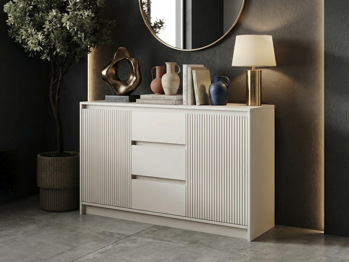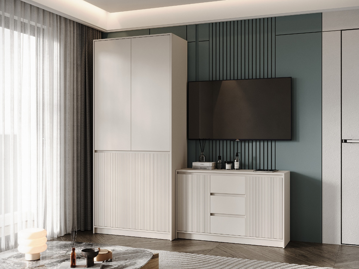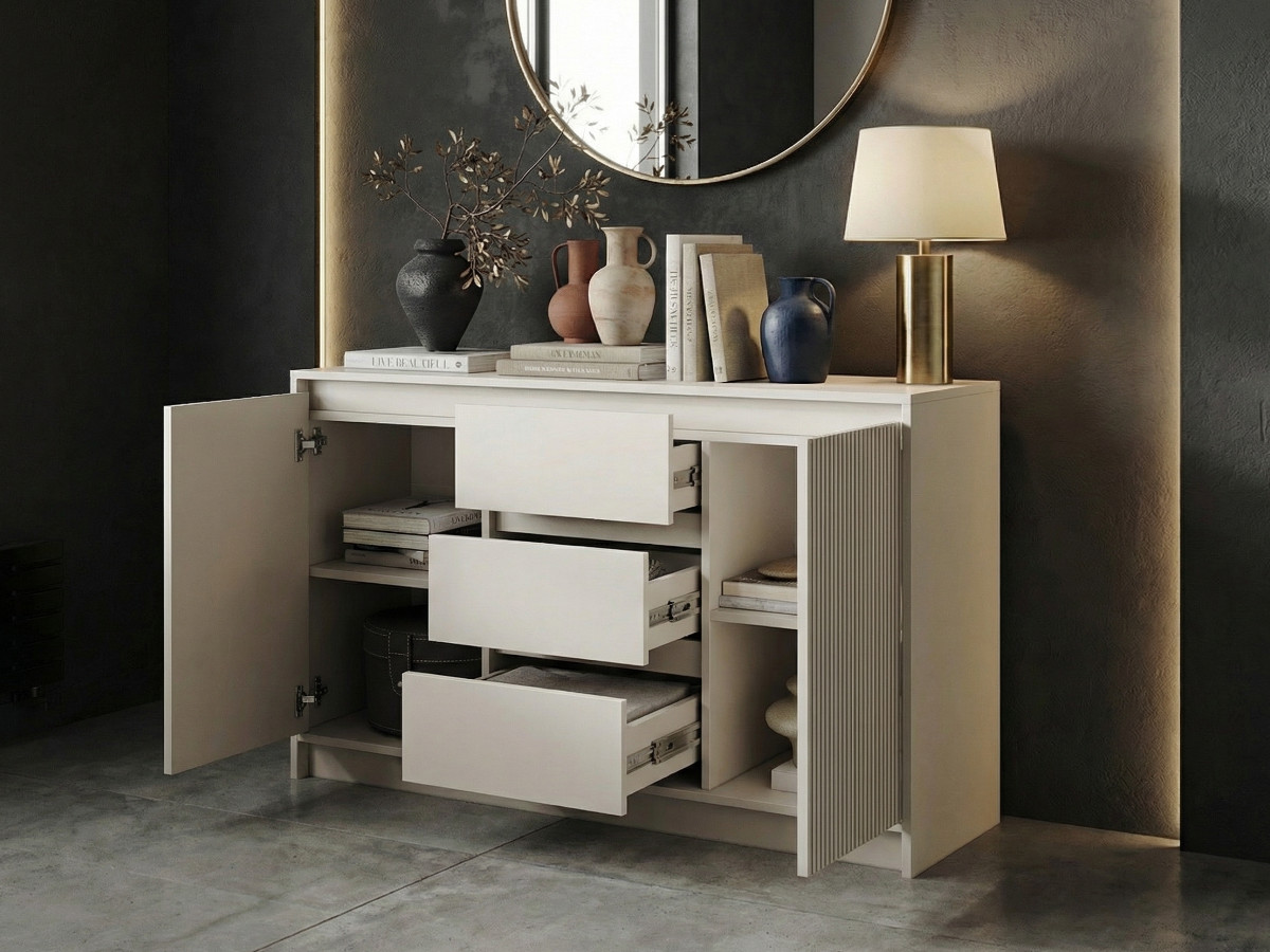 - Створки комода изготовлены из плиты МДФ 16мм и облицованы пленкой ПВХ. Для открывания створок предусмотрен зазор между фасадом и крышкой тумбы 30мм. Зазор закрыт изнутри планкой ЛДСП. За фасадами расположены полки съёмные, которые делят внутреннее пространство на 2 равные части Д.382 х В.282 х Г.358 мм.