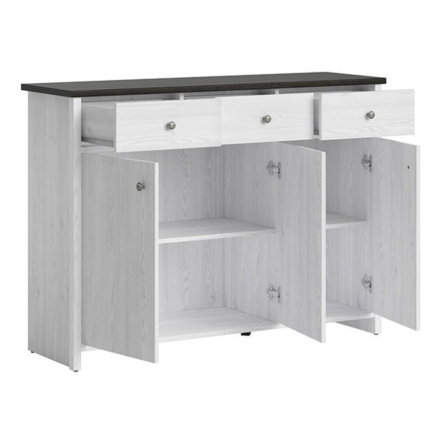 Комод содержит три выдвижных ящика и два закрытых отделения с полкой в каждом. Оборудован небольшими круглыми металлическими ручками серебристого цвета.