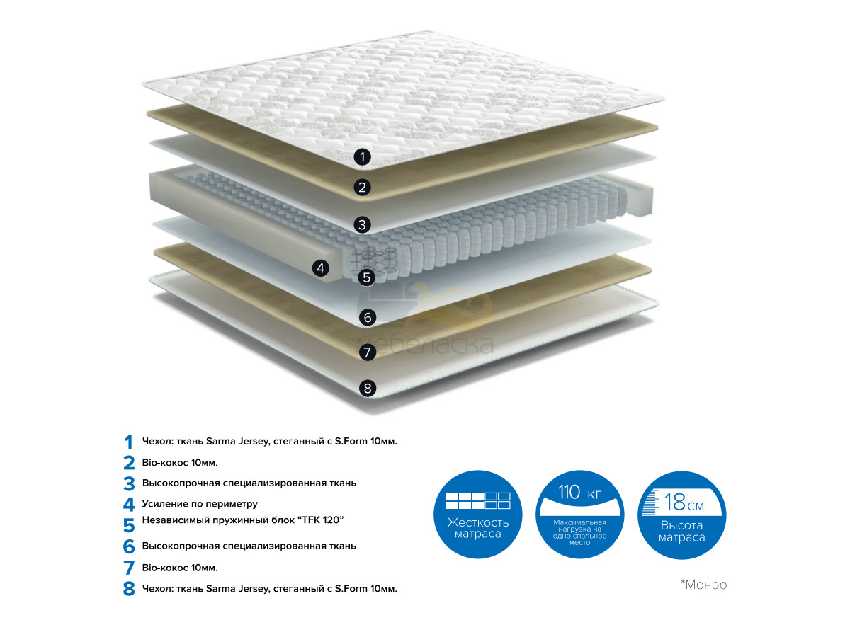 Наполнение : Блок независимых пружин 500 + Био-кокос 10мм + Эластичная пена 15мм
