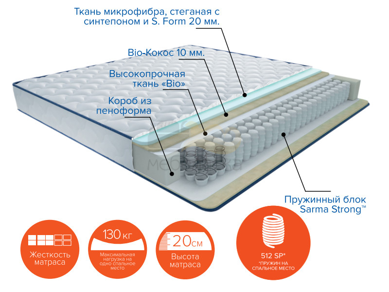 Наполнение: Независимый пружинный блок "Sarma Strong" (512 пружин на спальное место) + Био-кокос 10 мм + микрофибра, стеганая с Орто пеной 20 мм + короб из пеноформа.