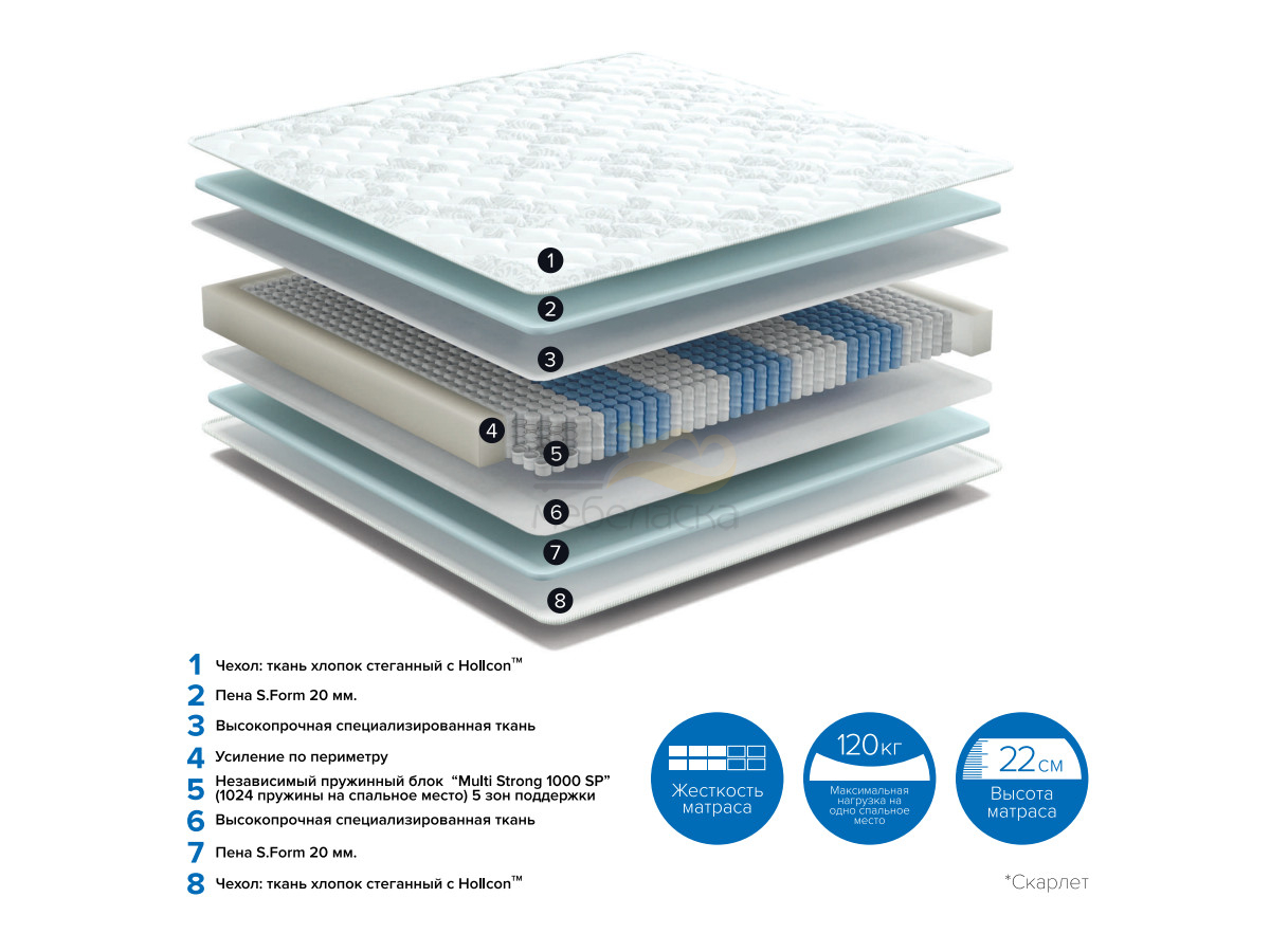 Наполнение : Блок независимых пружин MultiSTRONG" - 1024 пружины, 5 зон + Ортопедическая пена 2см + усиление по периметру коробом ППУ
