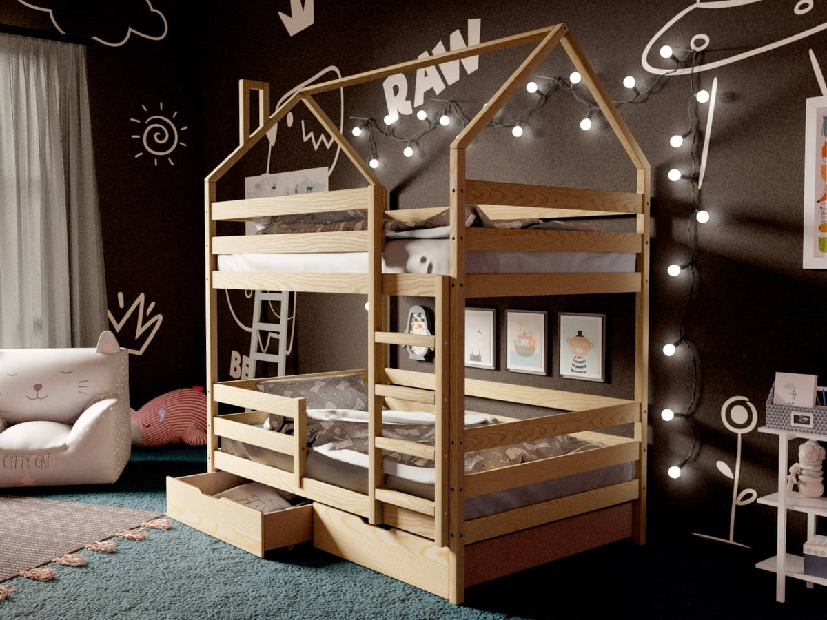 Двухъярусная кровать-домик без покраски 80х160 см с ящиками