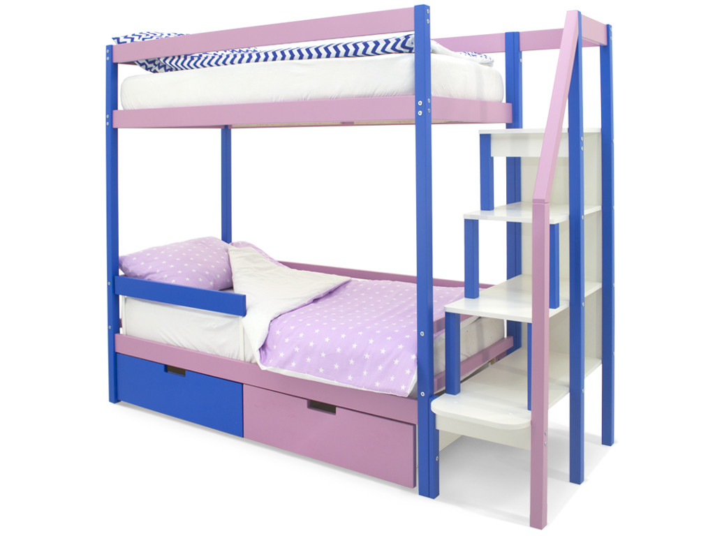 Двухъярусная кровать Svogen с ящиками и бортиком синий-лаванда