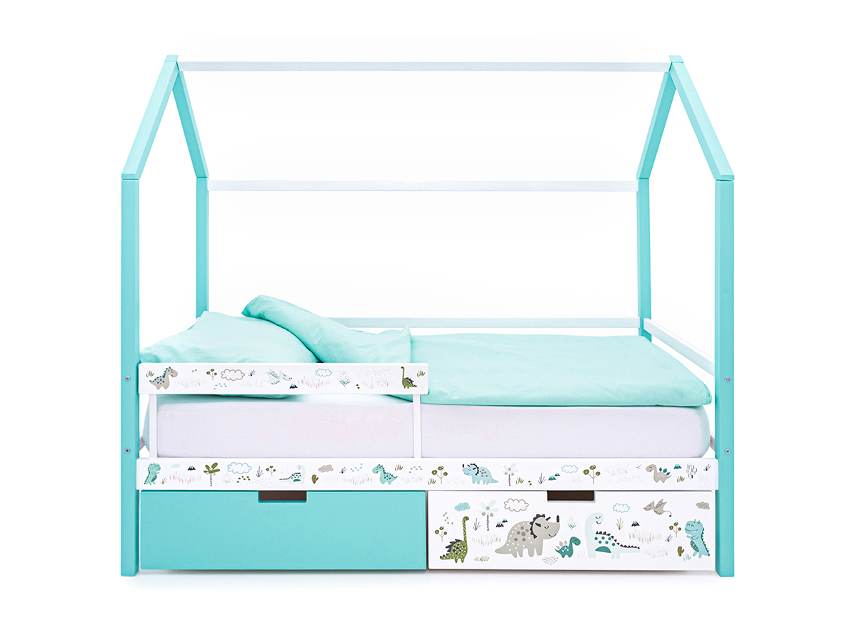 - Кровать-домик Svogen с фото с ящиками и бортиком мятный/динозаврики