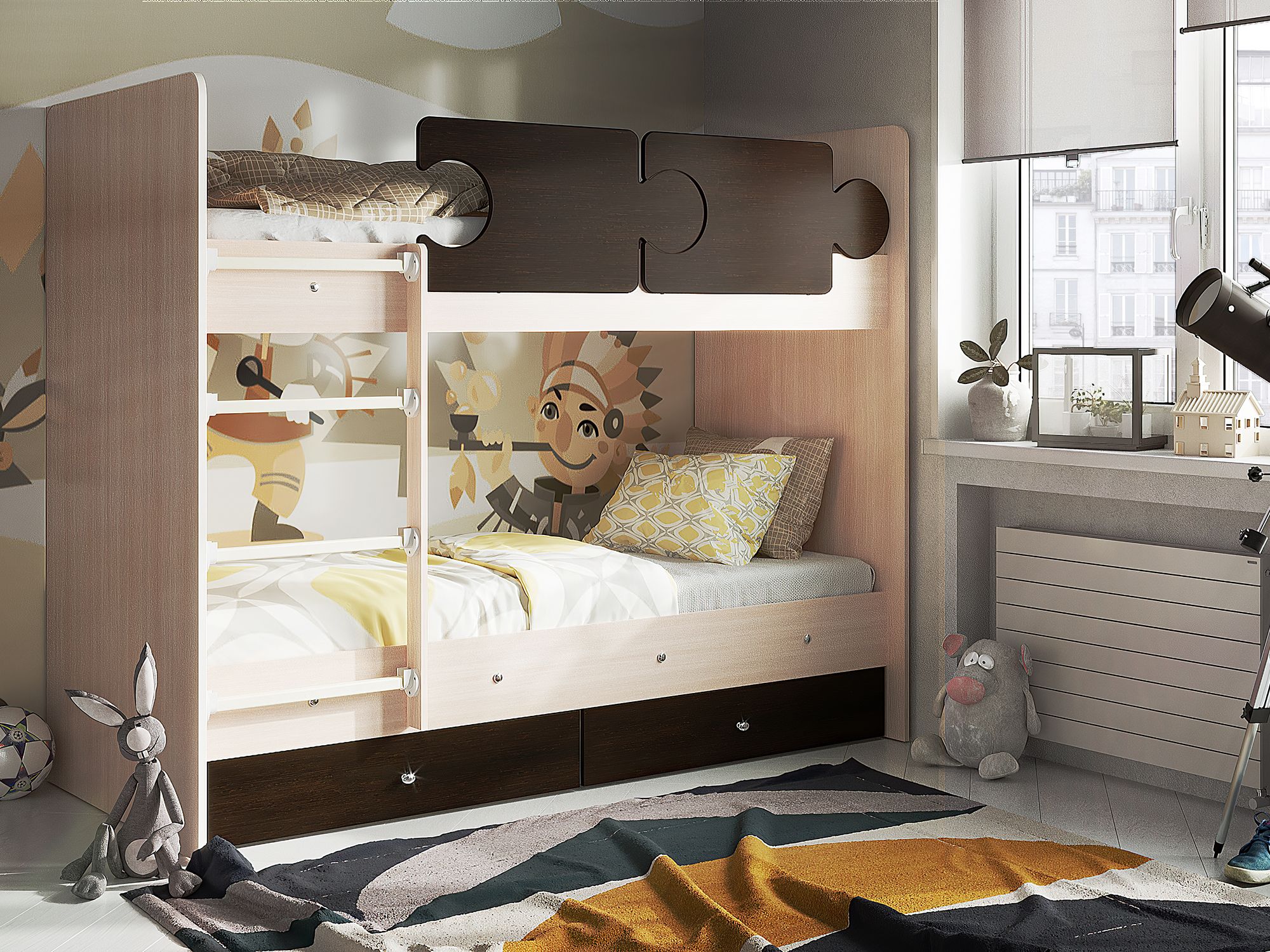 - Кровать двухъярусная Тетрис латы с бортиками дуб млечный-венге