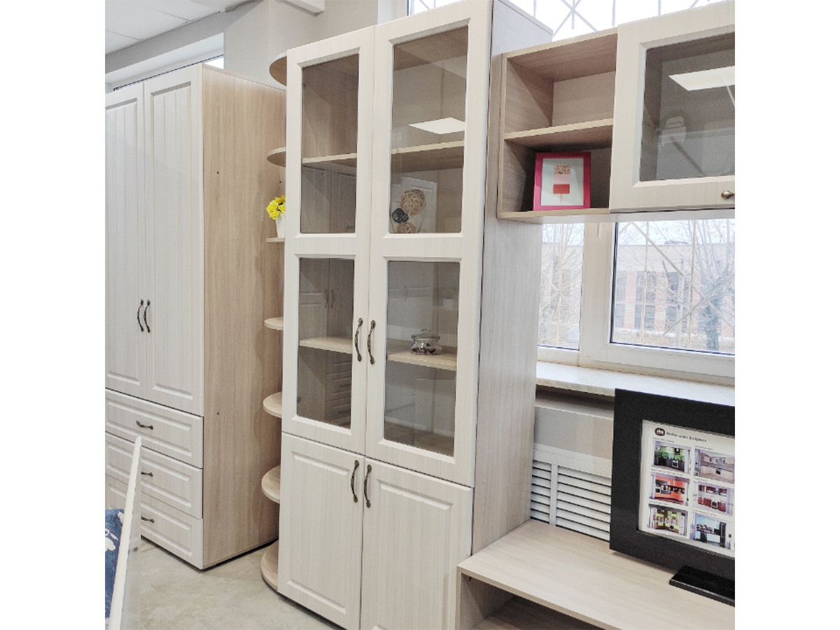 Состав комплекта: Пенал (стекло), Стеллаж угловой, Тумба ТВ, Шкаф навесной, Шкаф-900, Шкаф-900 (стекло)