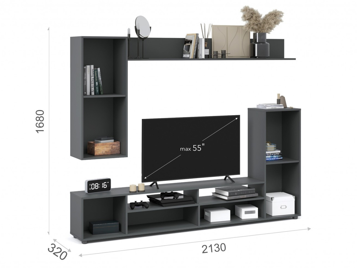 - Большая ниша для телевизора, закрытые шкафчики и открытые полки вместят в себя всё самое необходимое.