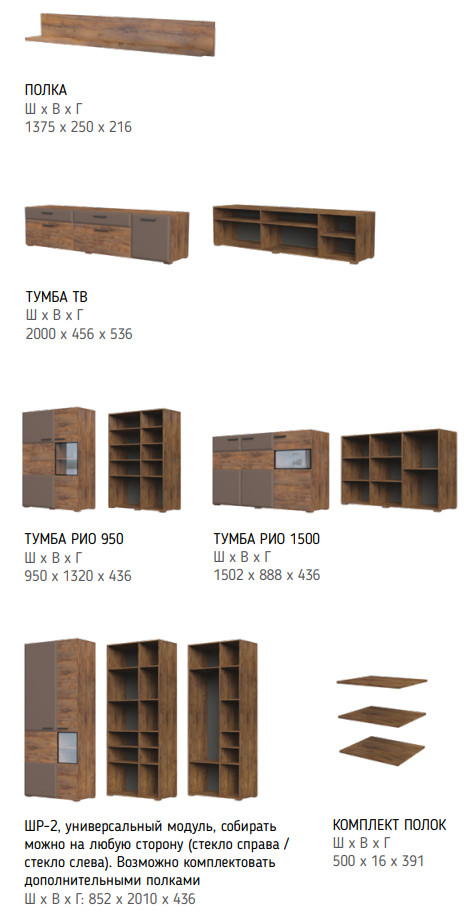 Цена за комплект: полка навесная, тумба 2 двери 950, тумба 3 двери 1500, тумба ТВ 3 двери 2000, шкаф ШР-2
