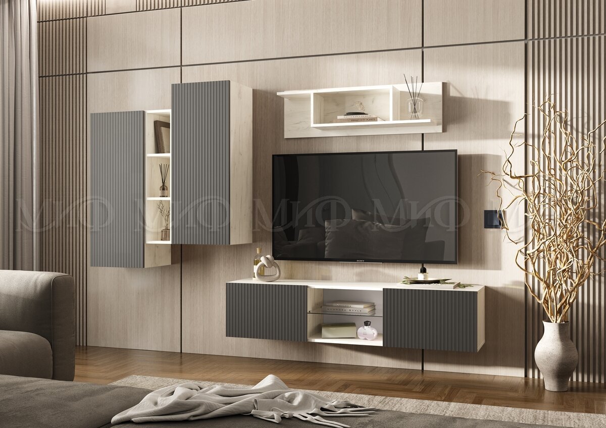 - Тумба ТВ подвесная 1500 Оскар Графит, Дуб Крафт Белый