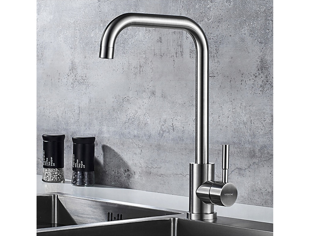 - Однорычажный смеситель для кухни в цвете сатин с высоким поворотным изливом.