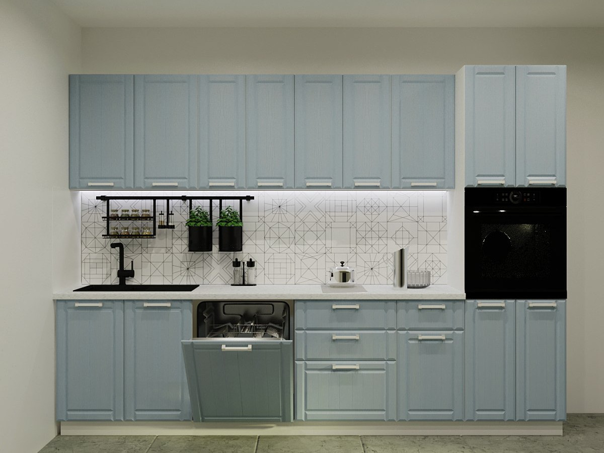 Кухонная мойка, стеновая панель, посудосушитель, планки для столешницы в комплект не входят.