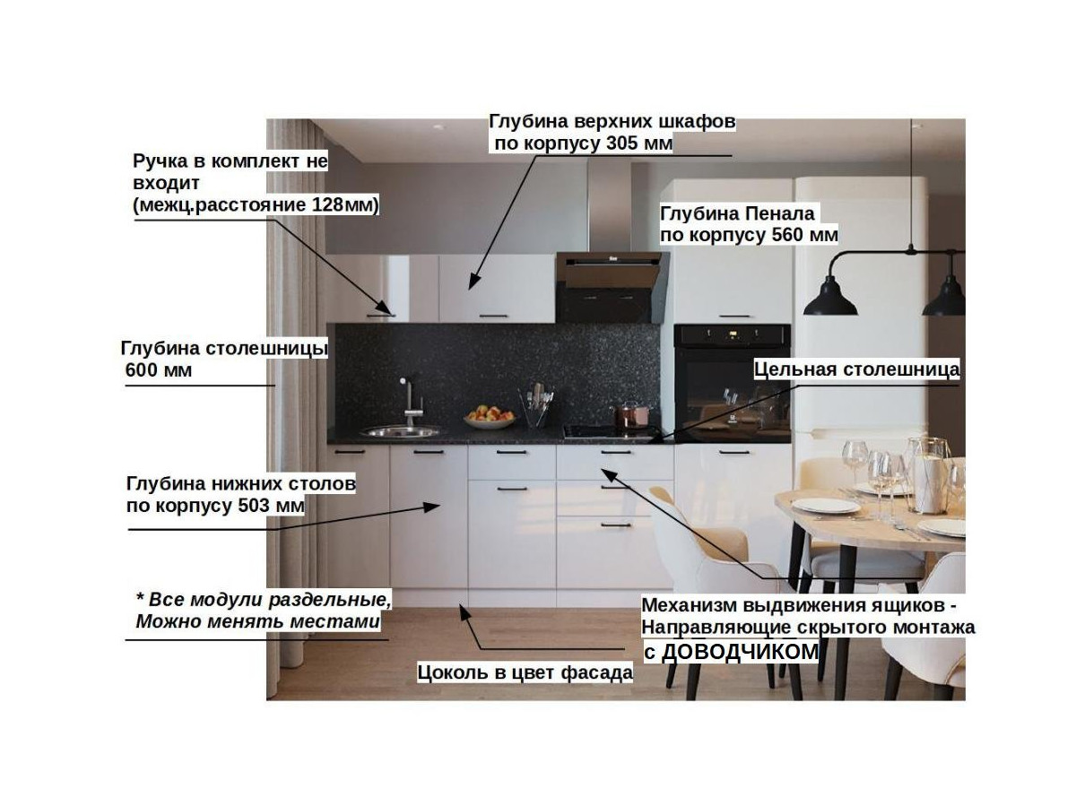 Кухонная мойка, стеновая панель, посудосушитель, планки для столешницы в комплект не входят.