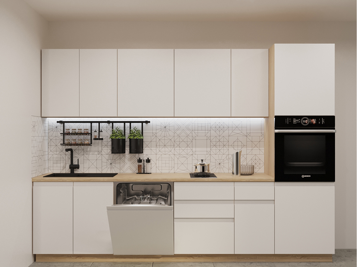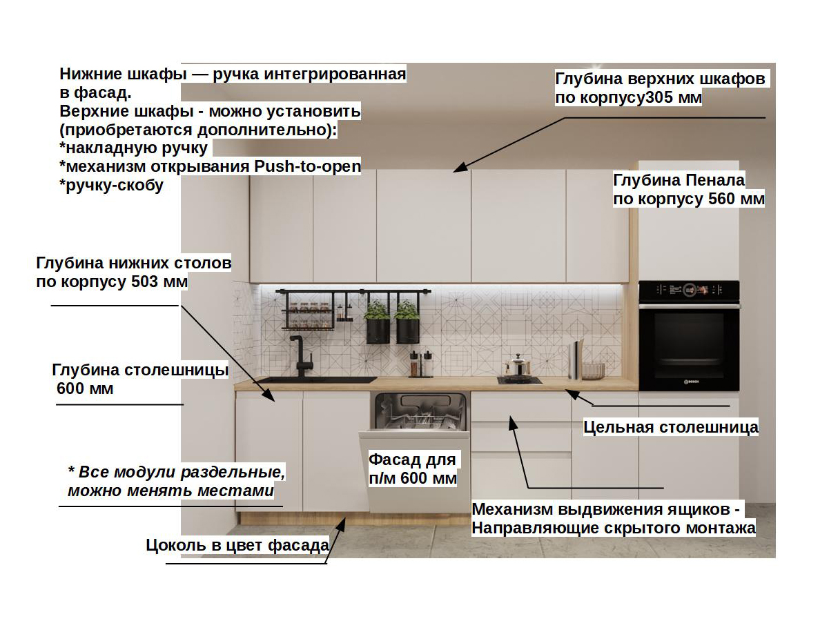 Кухонная мойка, стеновая панель, посудосушитель, планки для столешницы в комплект не входят.