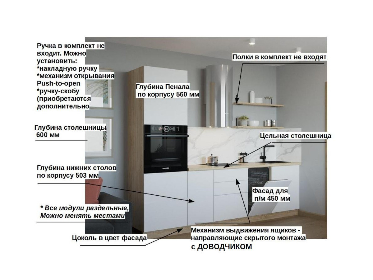 Кухонная мойка, стеновая панель, посудосушитель, планки для столешницы в комплект не входят.