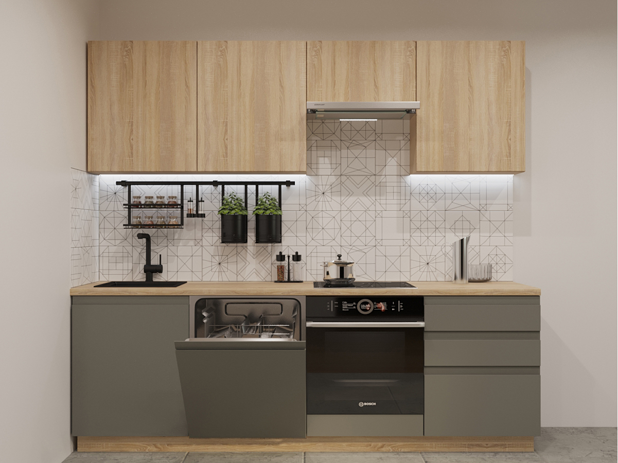 Кухонная мойка, стеновая панель, посудосушитель, планки для столешницы в комплект не входят.