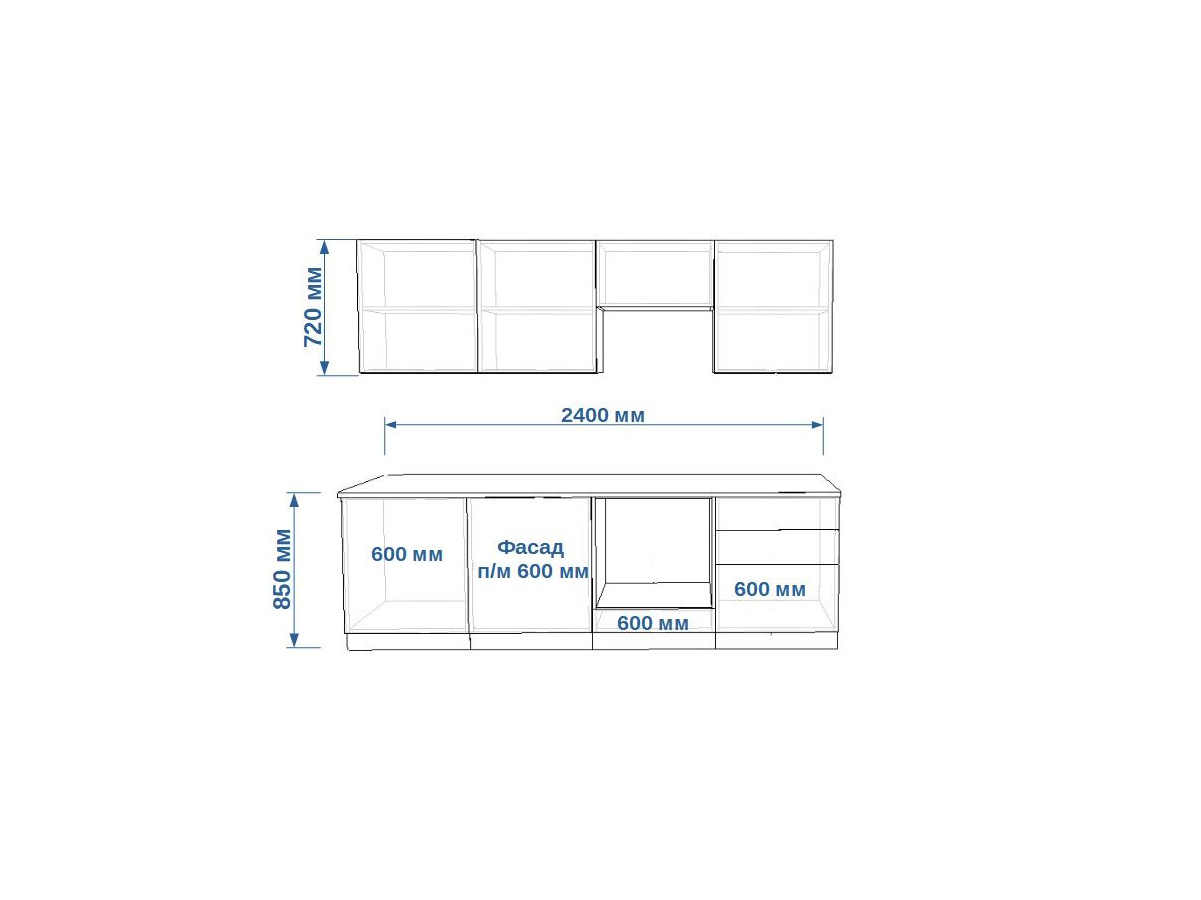 - высота верхних шкафов 720 мм