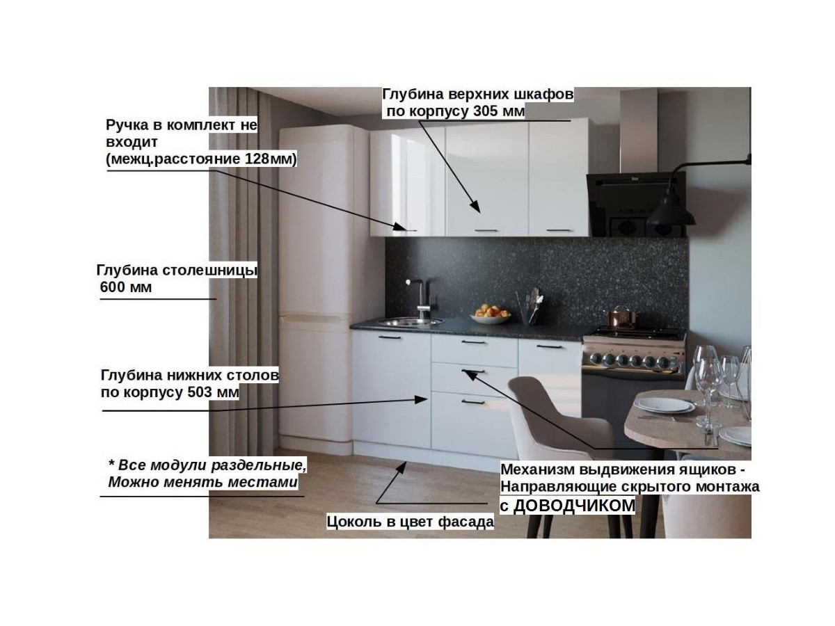 Кухонная мойка, стеновая панель, посудосушитель, планки для столешницы в комплект не входят.