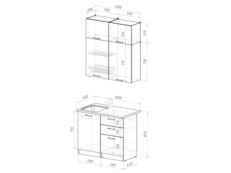 Мойка, смеситель, стеновая панель и посудосушитель в комплект гарнитура не входят.