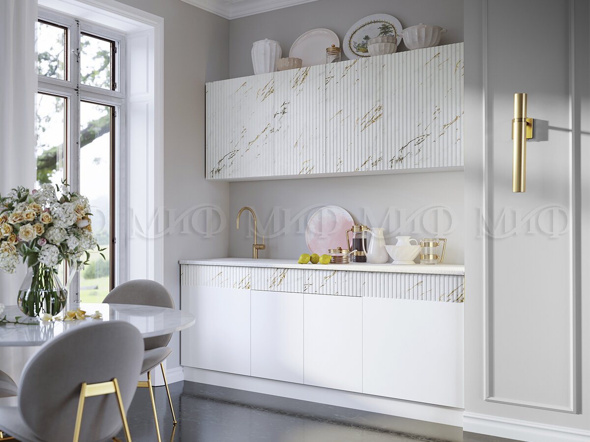 - Кухонный гарнитур Оливия 2000 Белый глянец холодный/Мрамор золото