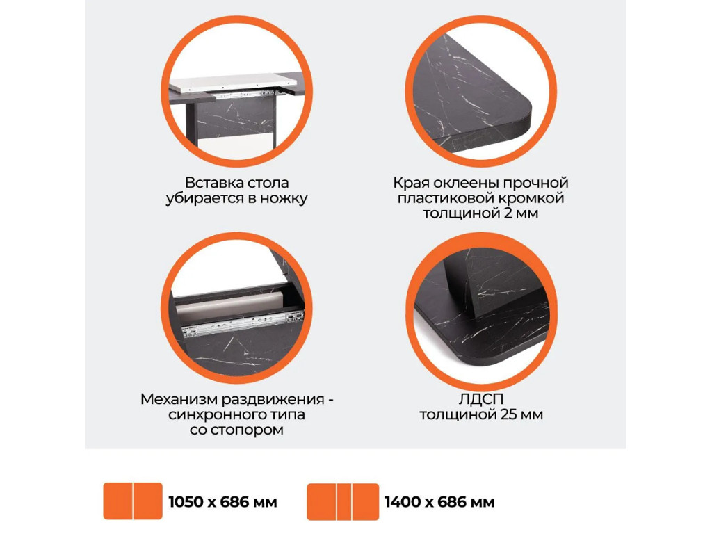 Прямоугольная столешница из ЛДСП толщиной 25 мм и оригинальная ножка-опора. Края стола оклеены прочной пластиковой кромкой толщиной 2 мм, что значительно продлит срок его службы. При необходимости можно быстро и легко увеличить размеры стола с помощью центральной секции, для этого используется механизм синхронного типа со стопором. Вставка стола легко убирается в ножку. За столом с комфортом могут разместиться от 4 до 6 человек.