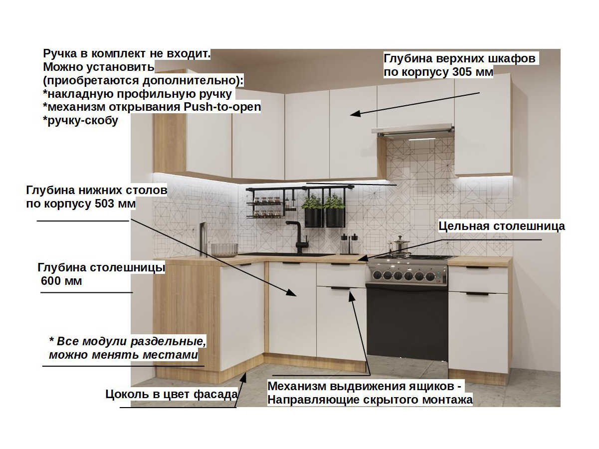 Кухонная мойка, стеновая панель, посудосушитель, планки для столешницы в комплект не входят.