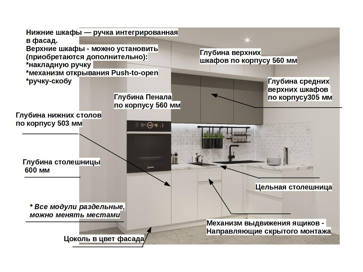 Кухонная мойка, стеновая панель, посудосушитель, планки для столешницы в комплект не входят.