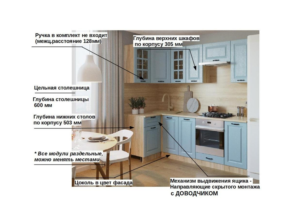 Кухонная мойка, стеновая панель, посудосушитель, планки для столешницы в комплект не входят.