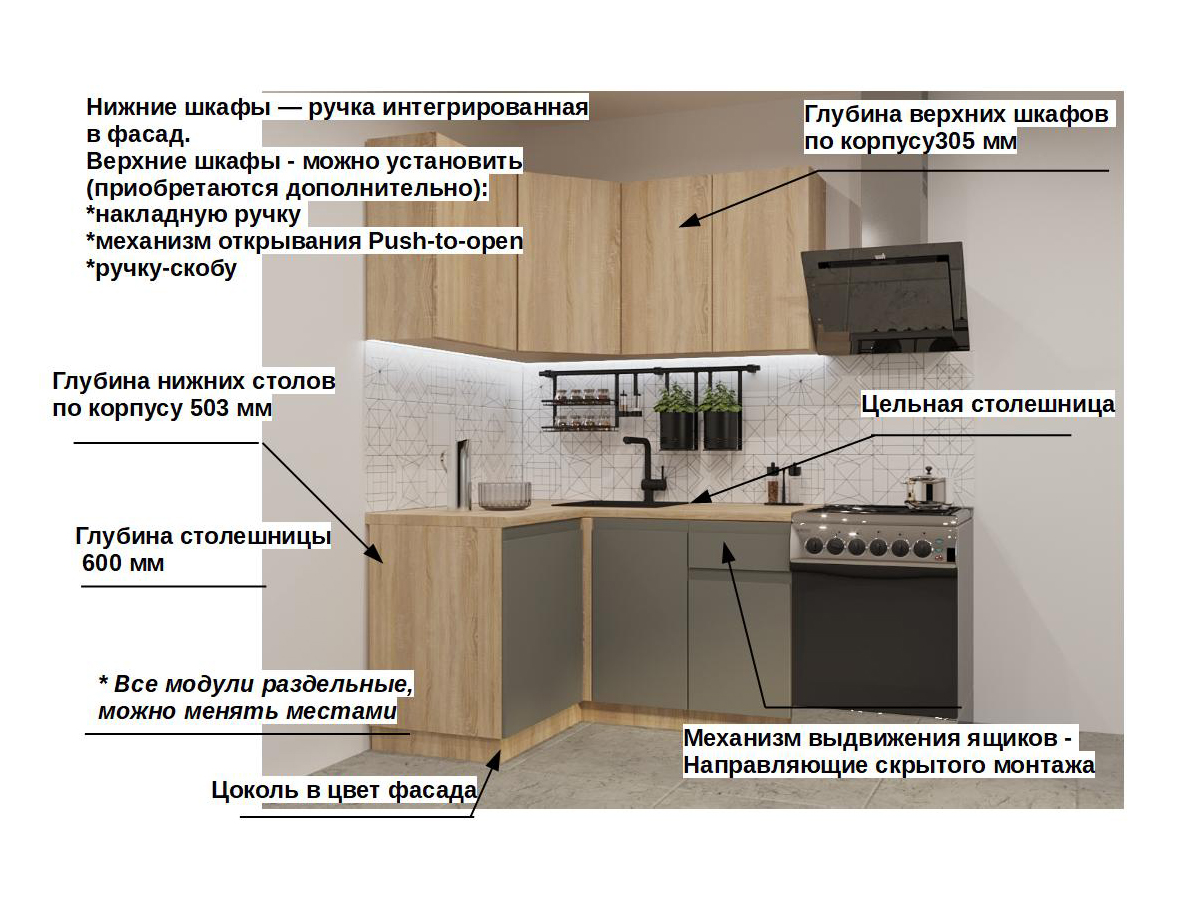 Кухонная мойка, стеновая панель, посудосушитель, планки для столешницы в комплект не входят.