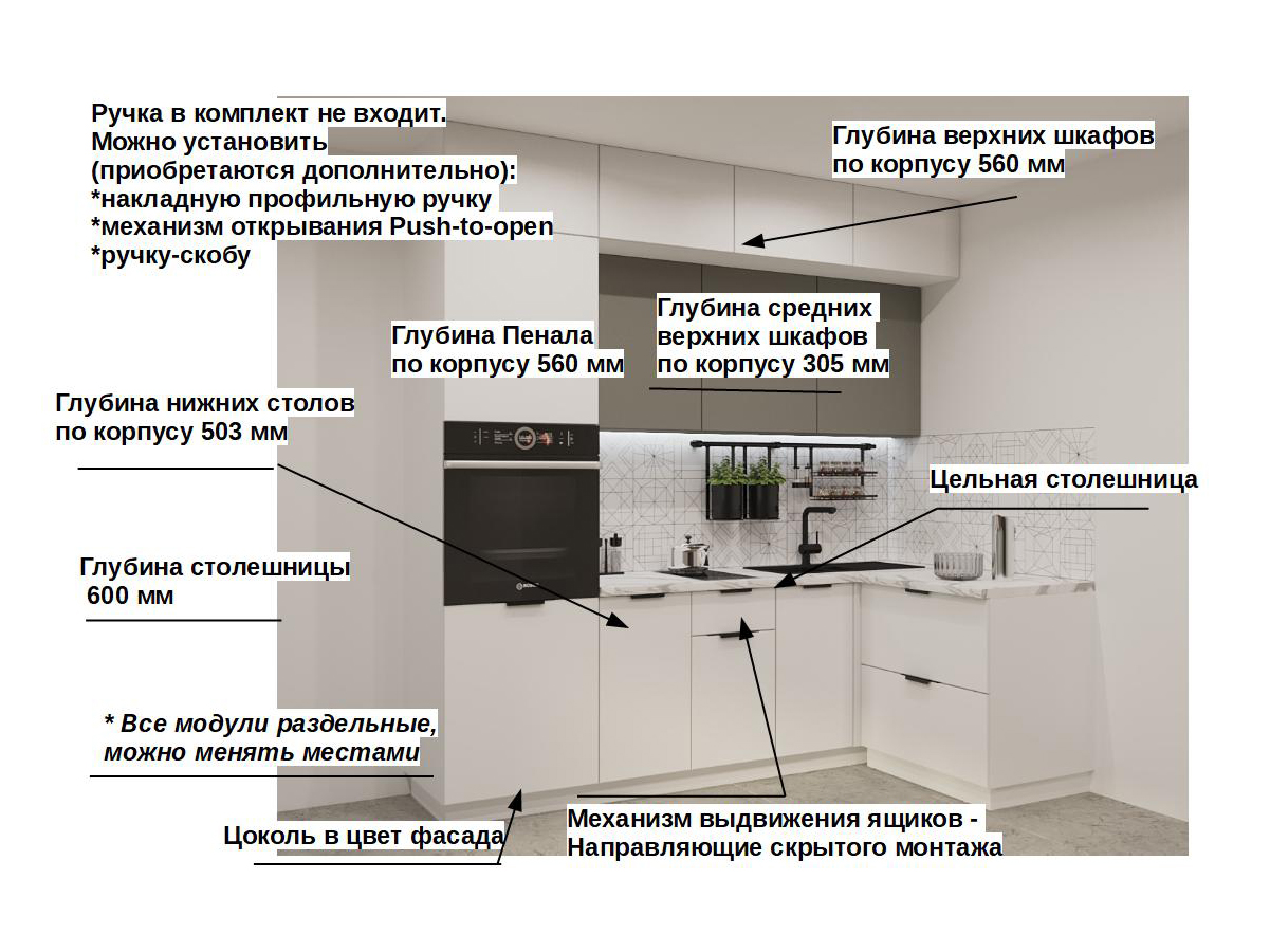 Кухонная мойка, стеновая панель, посудосушитель, планки для столешницы в комплект не входят.