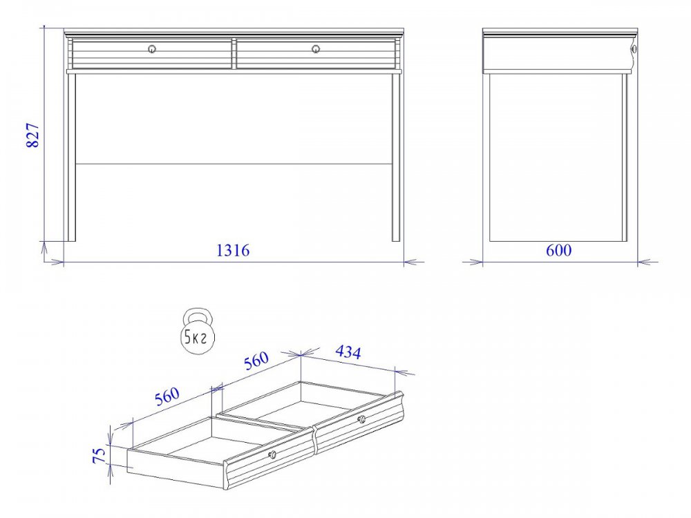 Письменный стол Сиена укомплектован двумя выдвижными ящиками. Шариковые направляющие надежно удерживают ящики при открывании. Максимальная нагрузка на ящик - 10кг.