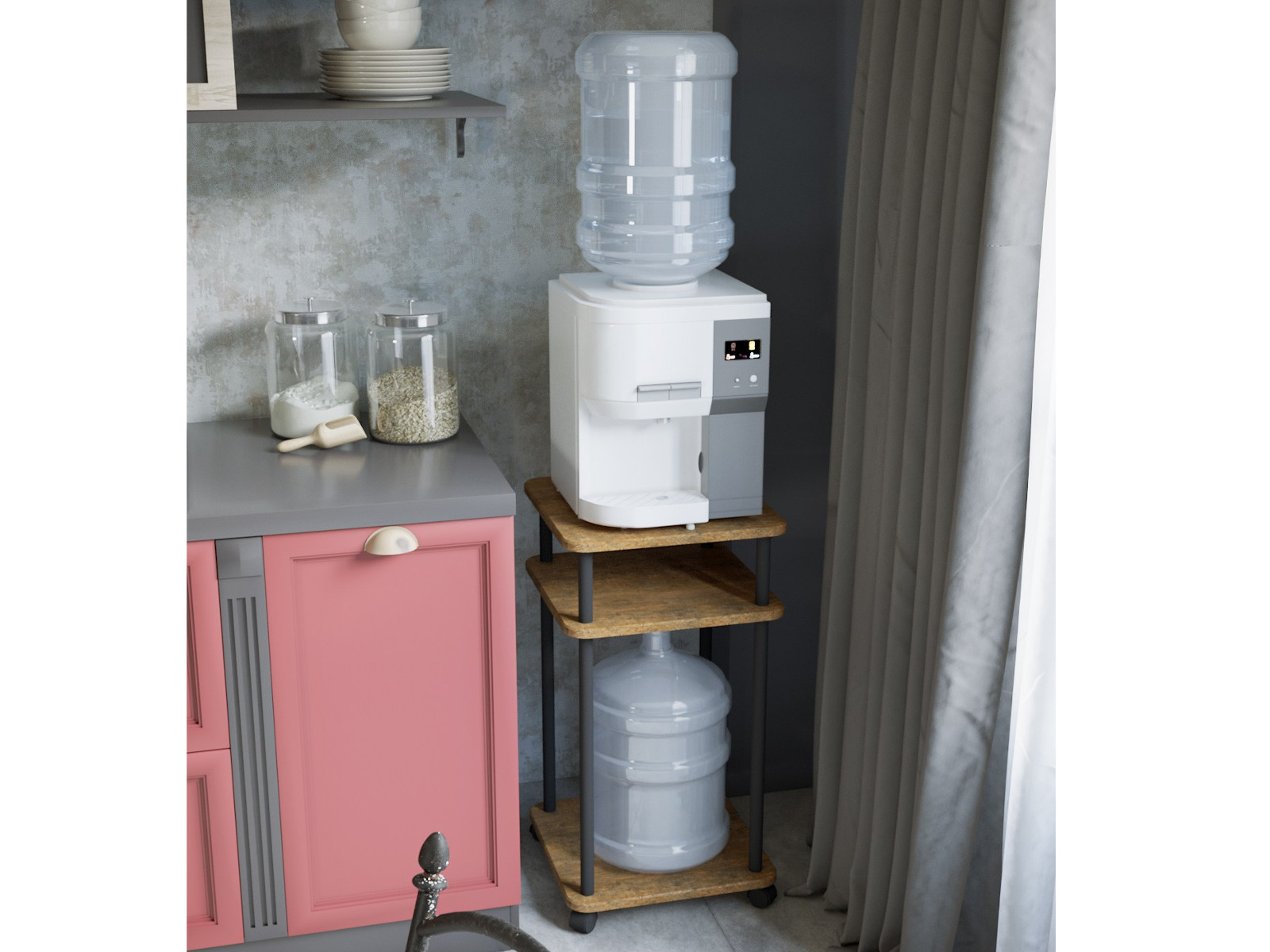 Подставка под кулер выполнена из материала МДФ 16 мм, опоры-хромированная туба. Высота подставки 750 мм, основание, полка и столешница имеют квадратную форму размером 400х400 мм. Подставка мобильна благодаря основанию на колесной опоре. Данная модель дополнена регулируемой по высоте полкой. Подставка рассчитана на кулер с бутылью и еще на одну запасную бутыль, что очень важно для экономии места дома или офиса.