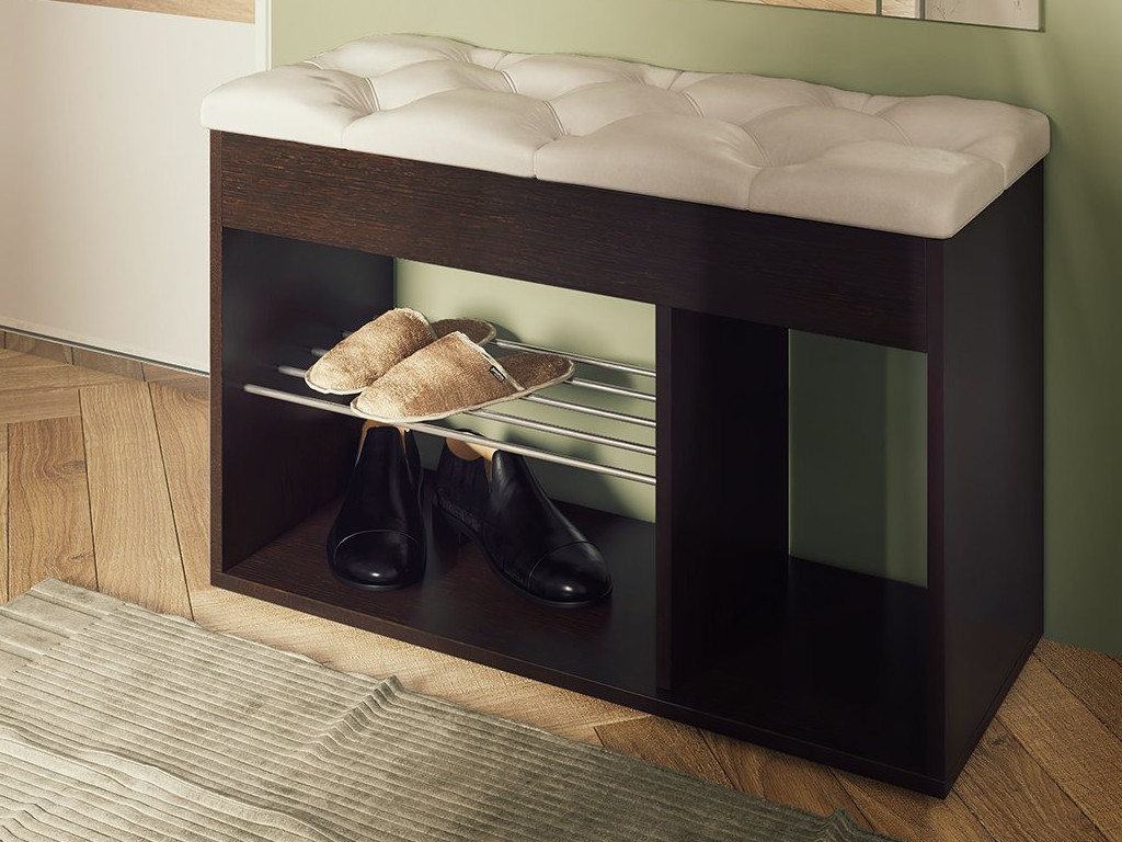 Удобный мягкий элемент и открытые ячейки делают её идеальной для небольшой прихожей. Основные ниши предназначены для кроссовок, туфель и тапочек, боковая же ниша — для более высокой обуви. А под откидной верхней крышкой — ниша для перчаток, зонтика, крема для обуви или других полезных мелочей, необходимых при выходе из квартиры.
