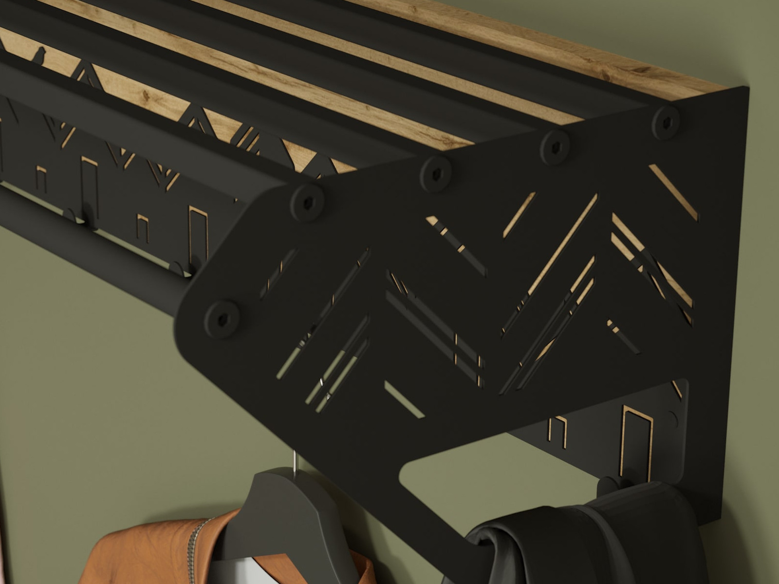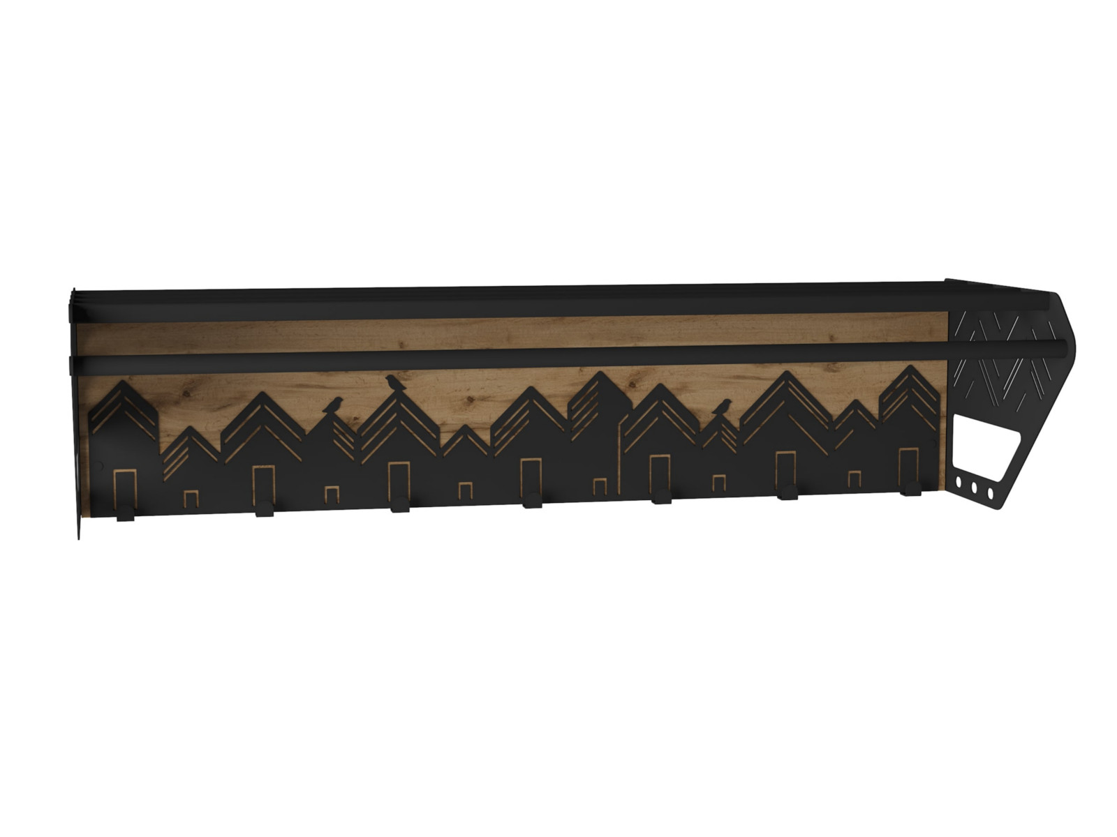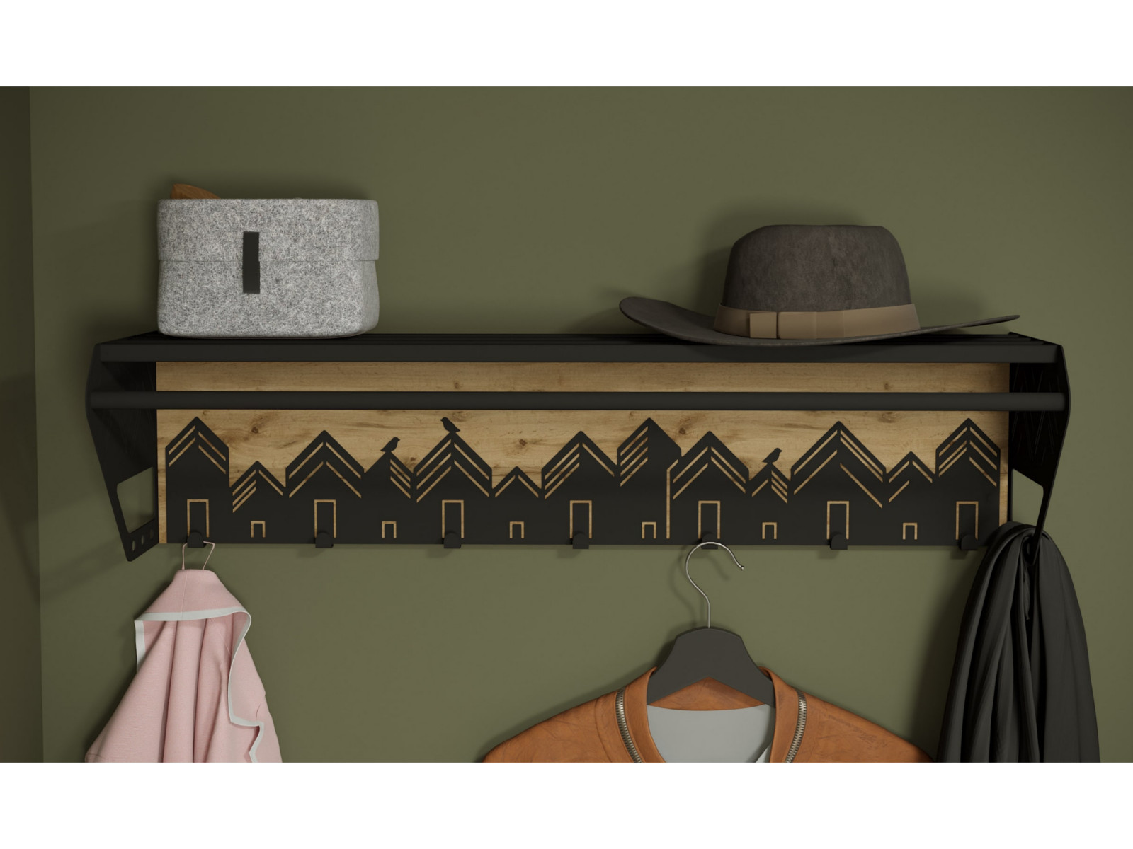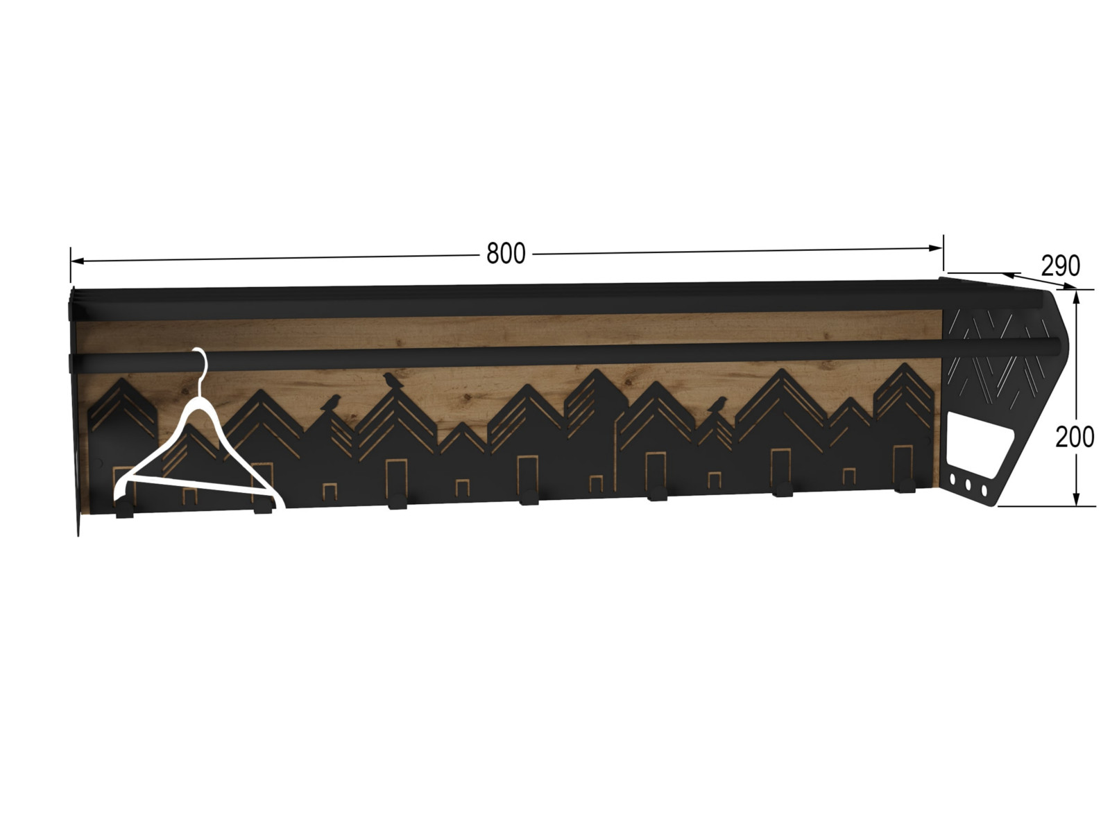 Вешалка выполнена из экологичного и прочного материала МДФ в сочетании с листовым металлом 1,5 мм.