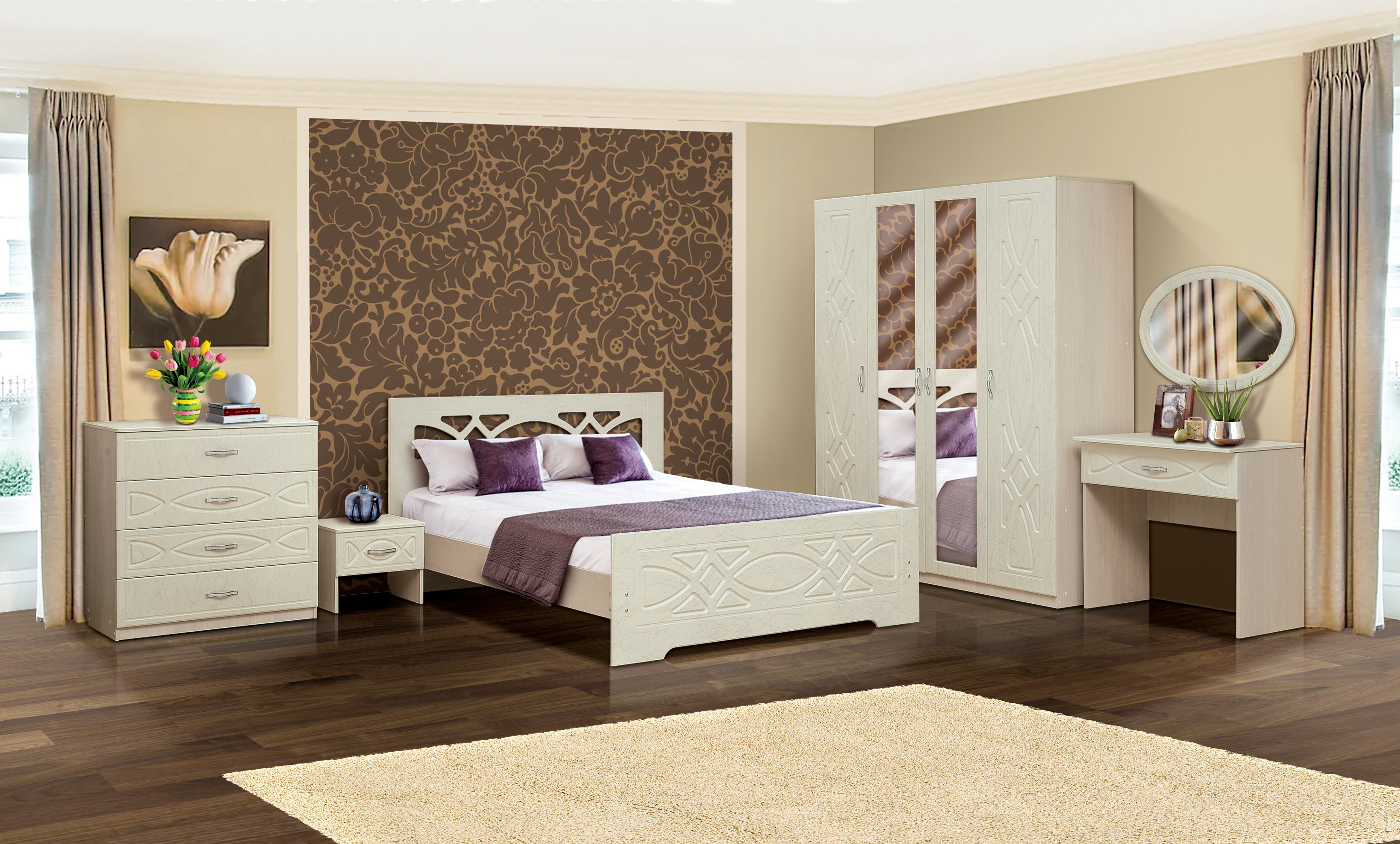 Спальня модульная, комплектуется по вашему выбору. Цена указана за комплект на главном фото - Кровать 1400х2000; шкаф 4-х дверный с 2-мя зеркалами; тумба прикроватная с ящиком -2 шт; комод с 4-мя ящиками; стол туалетный с ящиком; зеркало настенное