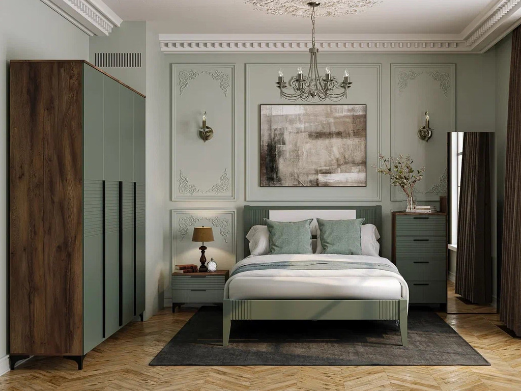 Цена за комплект: кровать Бетти 1400, Комплектующие на кровать с ламелями 1400 мм, шкаф ШР-4, комод с зеркалом, тумба прикроватная