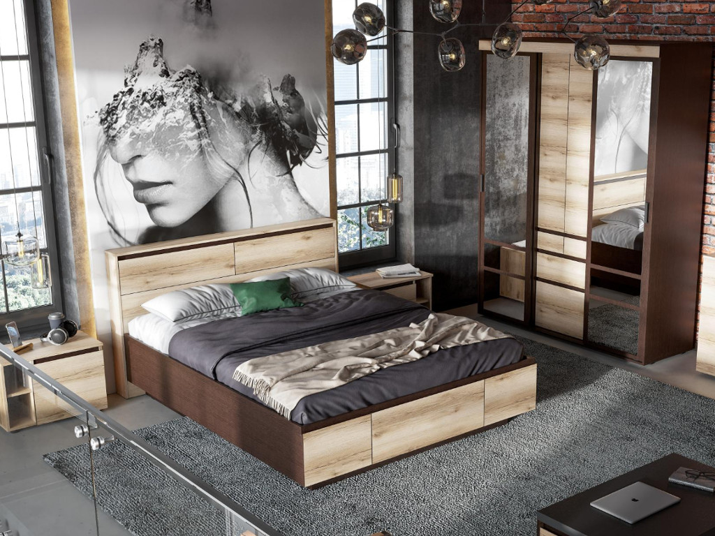 Цена указана за коплект: Кровать двойная, Шкаф-купе, Тумба прикроватная (2 шт)