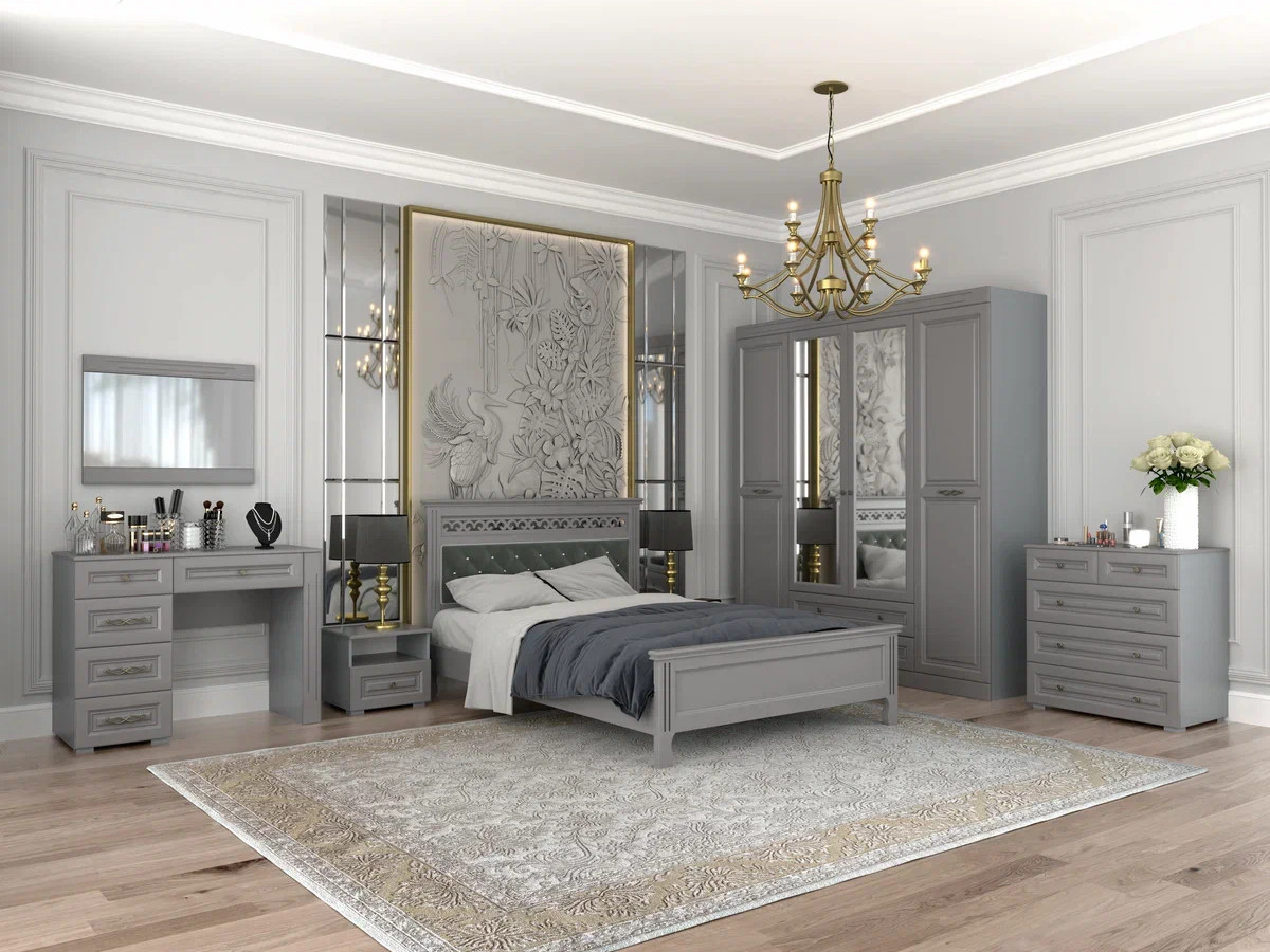 Цена за комплект: зеркало навесное с декоративными планками, стол туалетный, тумба прикроватная 1 ящик, комод 5 ящиков, шкаф для одежды ШР-4, кровать двойная "Грация" 1400, Комплектующие на кровать с ламелями 1400 мм