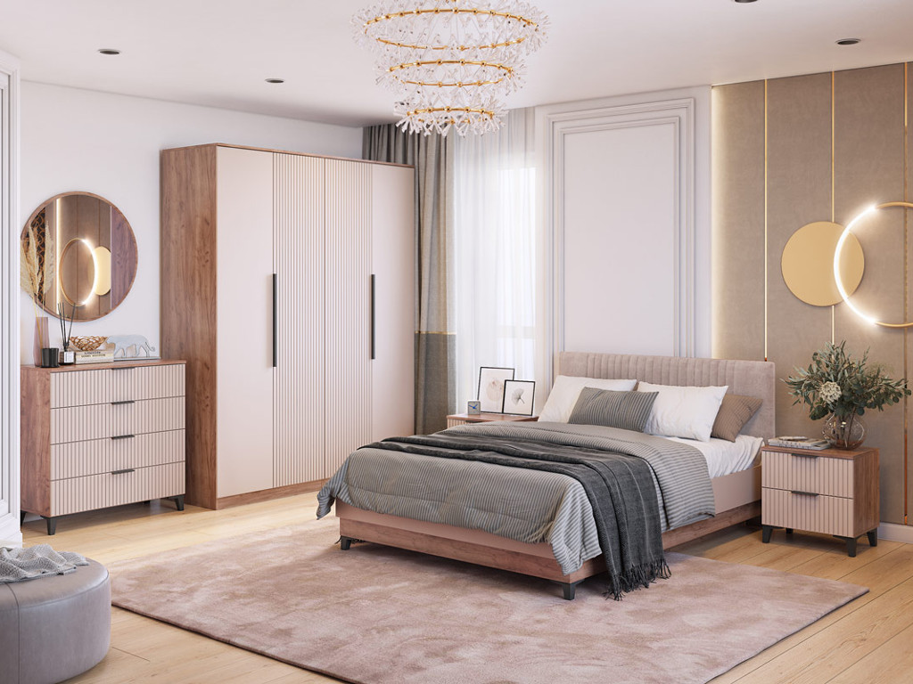 Цена за комплект: зеркало, комод 4 ящика, кровать люкс 1400 с ПМ, тумба прикроватная (2 шт), Шкаф для одежды 2 двери (2 шт)