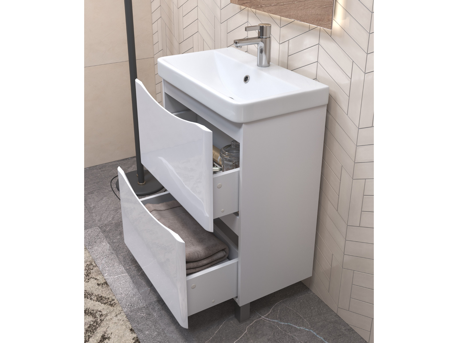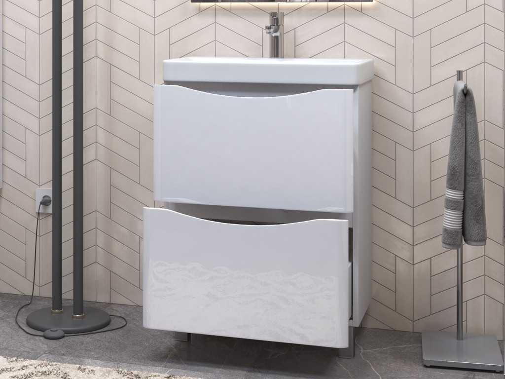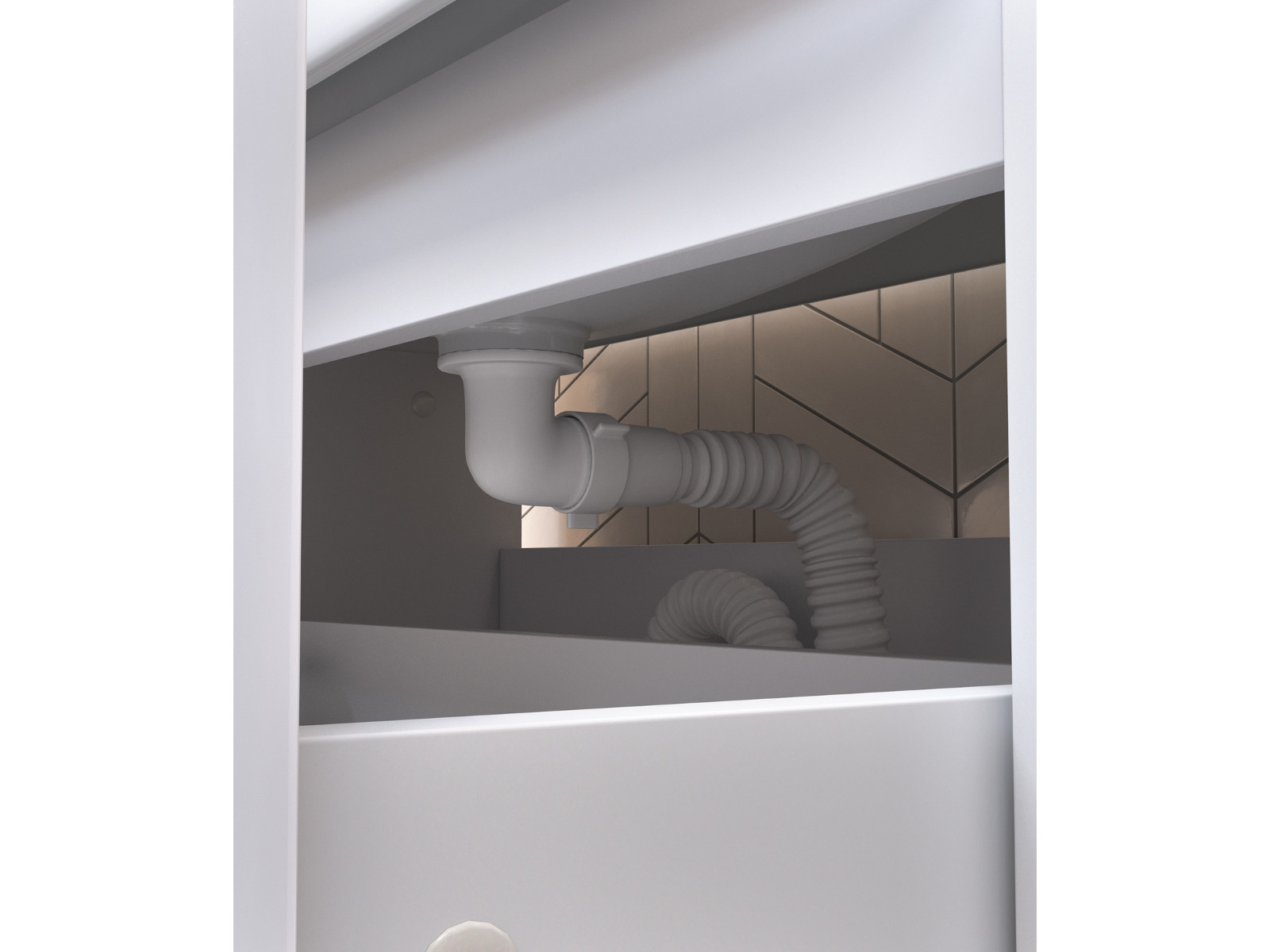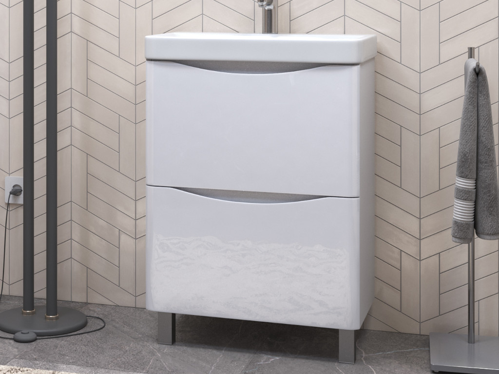 Оснащение: 2 выдвижных ящика, скрытые направляющие Hafele, интегрированная ручка, 2 навеса, 2 опоры квадратные регулируемые, 1 сифон
