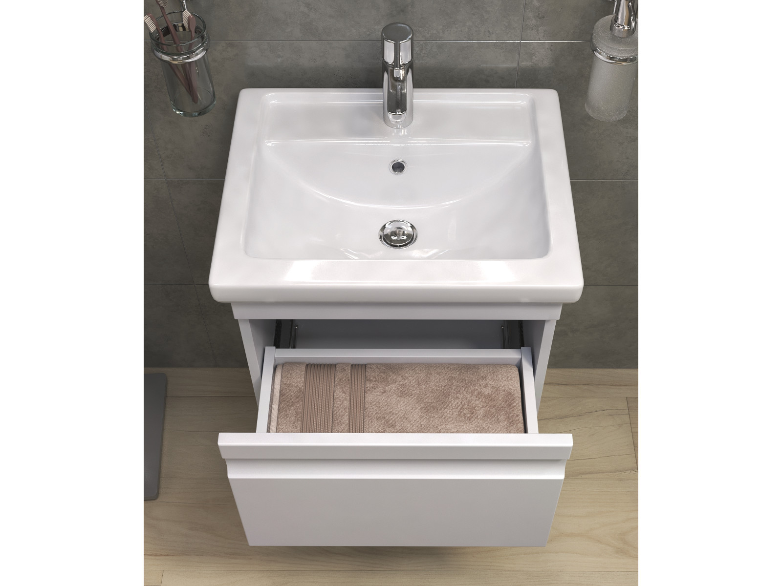 Оснащение: 1 выдвижной ящик, шариковые направляющие полного выдвижения, сифон