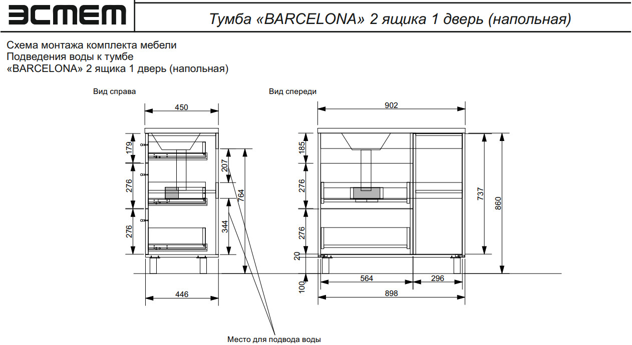 Тумба с раковиной Barcelona 900 левосторонний напольный 2 ящика 1 дверь