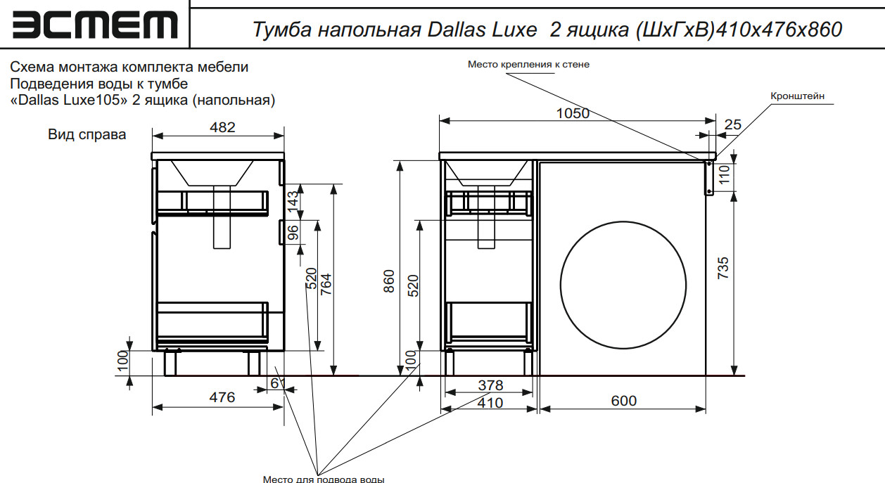 - Тумба с раковиной Dallas Luxe 1050 напольная 2 ящика левая