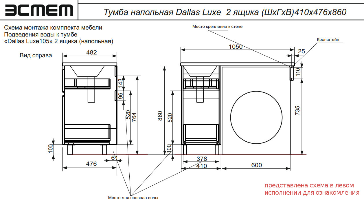 - Тумба с раковиной Dallas Luxe 1050 напольная 2 ящика правая