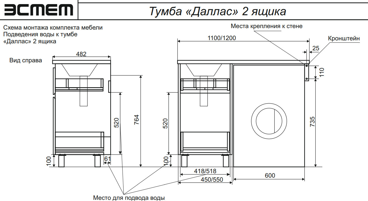 - Тумба с раковиной Dallas Luxe 1100 напольная 2 ящика левая