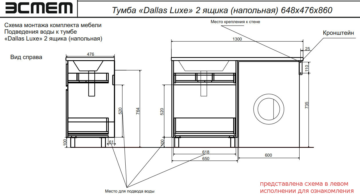 - Тумба с раковиной Dallas Luxe 1300 напольная 2 ящика правая