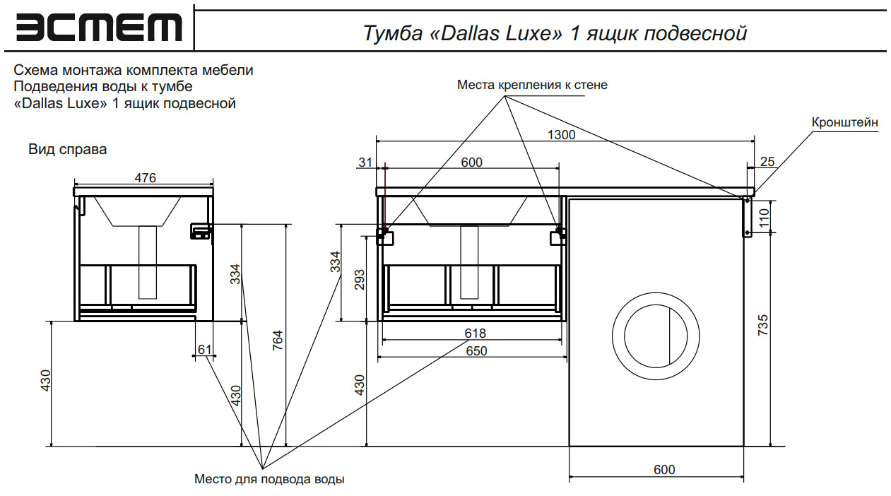 Тумба с раковиной Dallas Luxe 1300 навесная 1 ящик левая