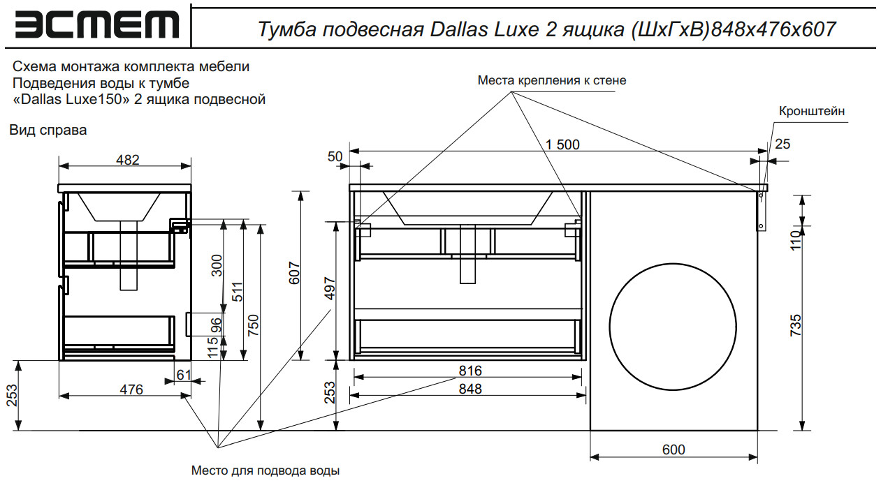 Тумба с раковиной Dallas Luxe 1500 навесная 2 ящика левая