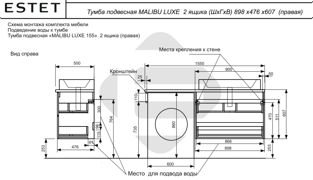 - Тумба с раковиной Malibu Luxe 1550 правосторонний подвесной 2 ящика