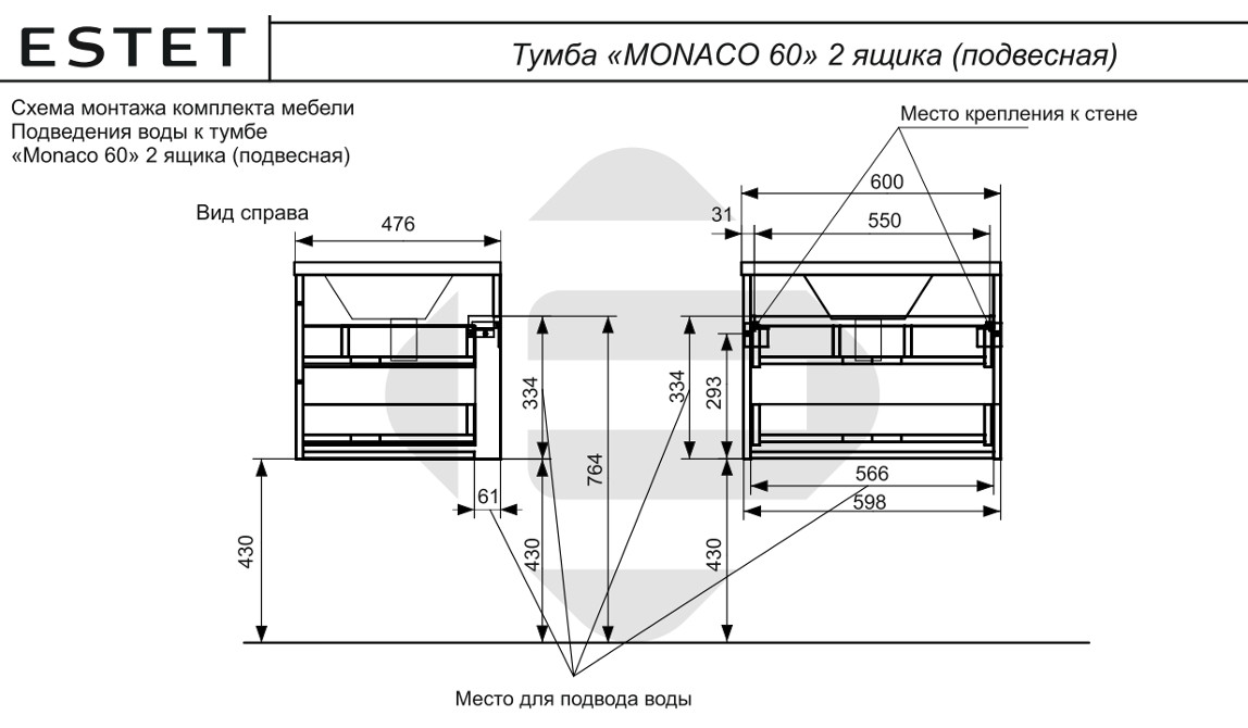 Тумба с раковиной Monaсo 600 навесная 2 ящика